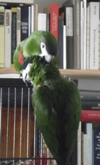 Zurück in Berlin, stellt er Jacky in Charlies Käfig, aber sicherheitshalber zuerst mal mit einer gläsernen Trennwand zwischen den beiden, damit sie sich aneinander gewöhnen können. Das scheint gut zu gehen. Die beiden Vögel sind vor allem neugierig, benehmen sich nicht feindselig. Am nächsten Tag wird die Trennwand entfernt. Was passiert? Jacky schmiegt sich sofort an Charlie und schwärmt romantisch: „I love you, Charlie… I love you, Charlie!“ (Foto oben)