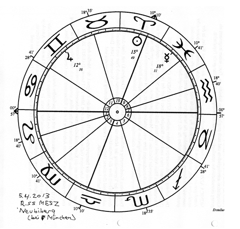 Das Horoskop ist vom 5. April 2013, 12.50 MESZ, Neubiberg bei München, und hat den Aszendenten auf 0°16′ Widder. Und Placidus-Häuser – mit Regiomontanus-Häusern funktioniert dieses Horoskop nicht! Es ist das Horoskop für die folgenden beiden Fragen: