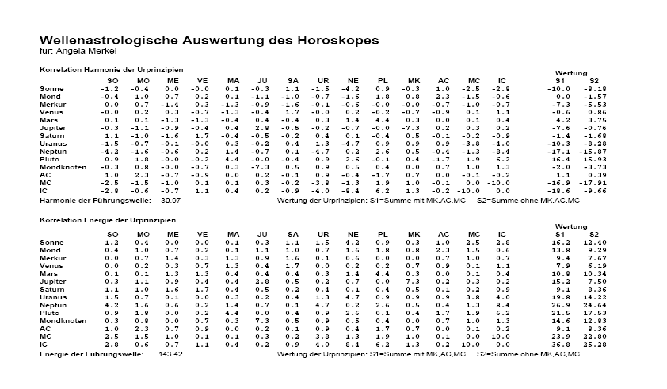 Die summarische Wertung der Planeten lässt verschiedene Aussagen zu, zum Beispiel über Risikobereitschaft, Intelligenzentwicklung, Unfallhäufigkeit. Dazu liegen bereits umfangreiche Untersuchungen vor. Es sind aber noch weitere Forschungen notwendig. Auf mundaner Ebene sind Aussagen über Erdbebenhäufigkeit ebenfalls gut gesichert und wurden vor Geophysikern vorgetragen. Die Quantifizierung der Planetenbeziehungen bietet neue Aussagemöglichkeiten: Die Matrix gibt den Gesamtzustand des Horoskops an. Dieser kann harmonisch oder disharmonisch sein. In der Wellenastrologie ist das der Zustand der Führungswelle des Individuums. Die Elemente der Matrix sind Schwingungszahlen und ermöglichen damit über die klassischen Auswertungsverfahren hinausgehende quantitative Beurteilungen der Qualität der Zeit. Hier sehen Sie die Matrix des Horoskops von Bundeskanzlerin Angela Merkel.