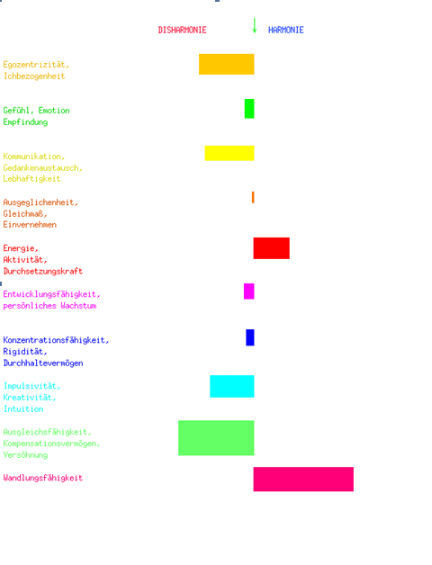Es ist individuell, nicht als Vergleich, sondern für die Arbeit mit dem jeweiligen Klienten gedacht. Das Balkendiagramm ermöglicht einen schnellen Überblick über Harmonie (Länge des jeweiligen Balkens) und Energie (Breite des jeweiligen Balkens) der Urprinzipien sowie über die Freiheit, die das Individuum bei der Gestaltung seiner Lebensverhältnisse hat. Die Balken zeigen die Harmonie bzw. Disharmonie und die Energie von Sonne, Mond, Merkur, Venus, Mars, Jupiter, Saturn. Uranus und Neptun an. Stärken bzw. Probleme werden schnell sichtbar. Bei Angela Merkel zeigen Mars und Pluto eine besonders starke Energie.