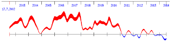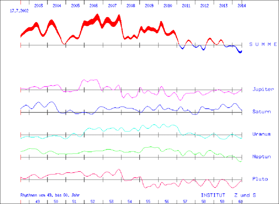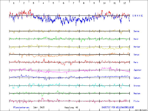 Die wellenastrologische Darstellung der Planetenrhythmen ermöglicht es, sich über allgemeine Tendenzen schnell einen Überblick zu verschaffen. Man kann die Kurven für ein ganzes Jahr, für einen Monat oder einen Tag ansehen, ebenso aber auch für große Zeiträume.