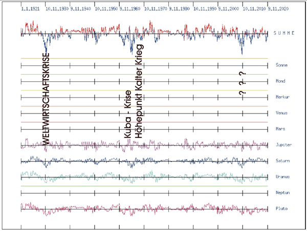 Damit sind qualitative und quantitative Aussagen möglich: Welche Urprinzipien sind für eine Entwicklung besonders begünstigend? Zwischen welchen Planeten sind Spannungen, die für eine Entwicklung besonders tragfähig sind? Die Entwicklung erfolgt durch das Pendeln zwischen Stabilität und Instabilität. Die stärksten Spannungen zwischen zwei Planeten liegen bei – 10, die höchsten Harmonien bei + 8.