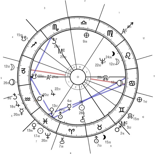 Es geht aber auch um einen Angriff gegen eine gesellschaftliche Autorität. Das erkennen wir an Mars, der exakt am MC seine Kraft im Zeichen Zwilling entfaltet, also wieder in den Medien. Das Gespräch als Waffe sehen wir desweiteren darin, dass Mars nach klassischer Zuordnung auch das Zeichen Skorpion beherrscht. In den Skorpion fällt das dritte Haus, das Haus der Kommunikation.