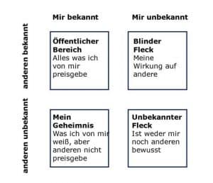 - Blinder Fleck: Dies sind Dinge über mich, von denen ich nichts weiß, aber die andere erkennen können. Zum Beispiel kann ich ein Verhaltensmuster haben, das für mich unbewusst, aber für andere offensichtlich ist. Vielleicht benutze ich beim Sprechen oft eine bestimmte Floskel oder fasse mir öfters an mein Ohr, wenn ich aufgeregt bin. Wenn andere mir ein Feedback über meine Verhaltensmuster, die ihnen an mir auffallen, geben, dann wird der blinde Fleck kleiner und der Öffentliche Bereich bei mir größer.