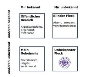 - Unbekannter Fleck oder unbekanntes Selbst: Dies sind Dinge, die weder ich noch andere über mich wissen. Es kann sich um unentdeckte Fähigkeiten, unerforschte Interessen oder tief verborgene Gefühle handeln.