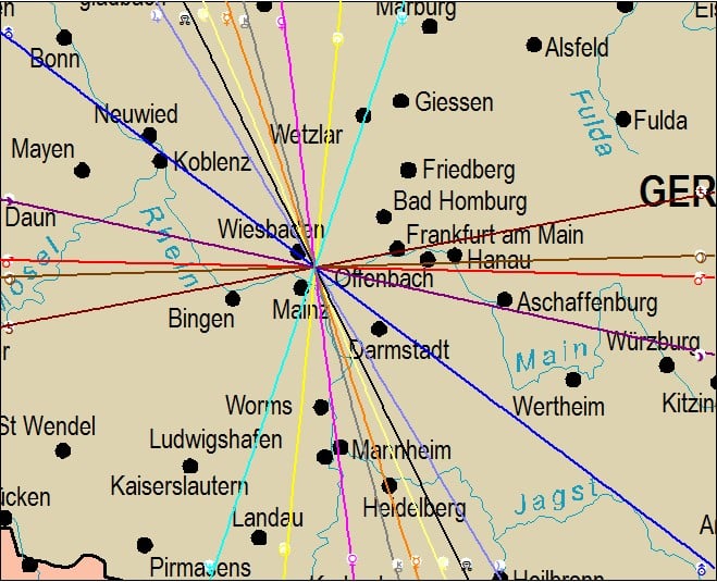 Interessant ist die räumliche Komponente des Horoskops in der Astrokartografie, wenn man die Planetenlinien über den Gründungsort Wiesbaden hinaus verlängert. Uranus, der Planet der Astrologen zieht nicht weit weg von Bonn seine Linie, wo wir lange Zeit die Jahresversammlung der Mitglieder und unsere Kongresse abgehalten haben. Die Geschäftsstelle liegt auf der Merkurlinie, die exakt durch Heidelberg geht. Wo sollte man sein Büro anmieten, wenn nicht auf einer Merkurlinie?