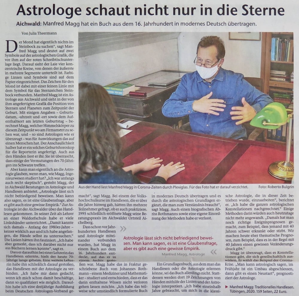 Im letzten Newsletter haben wir das neue Buch von Manfred Magg vorgestellt, Koryphäe für Handlesen, mit und ohne Kombination mit der Astrologie. Dazu gibt es auch einen ausführlichen Hintergrundbeitrag in der Esslinger Zeitung, Wochenendausgabe 31.10./01.11.2020, den wir Ihnen nicht vorenthalten möchten und hier als Faksimile anfügen: