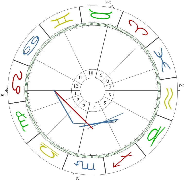Als leer definiere ich einen Halbkreis, wenn sich weder ein Planet, noch der nördliche Mondknoten oder Chiron darin aufhalten. Das ist auch dann noch der Fall, wenn sich eine der o.g. Komponenten unterhalb einer der beiden Achsenpole in Konjunktion zu diesem und in dem gleichen Zeichen befindet (Orbis ca. 10 Grad). Da dieser Ausreißer nicht weit gekommen ist, kann er der vollen Hälfte nichts entgegensetzen. Dies ist gut an den Aspekt Linien zu erkennen, die, mit Ausnahme des eventuellen Aspektes zum IC, ausschließlich in die belebte Hemisphäre verlaufen.
