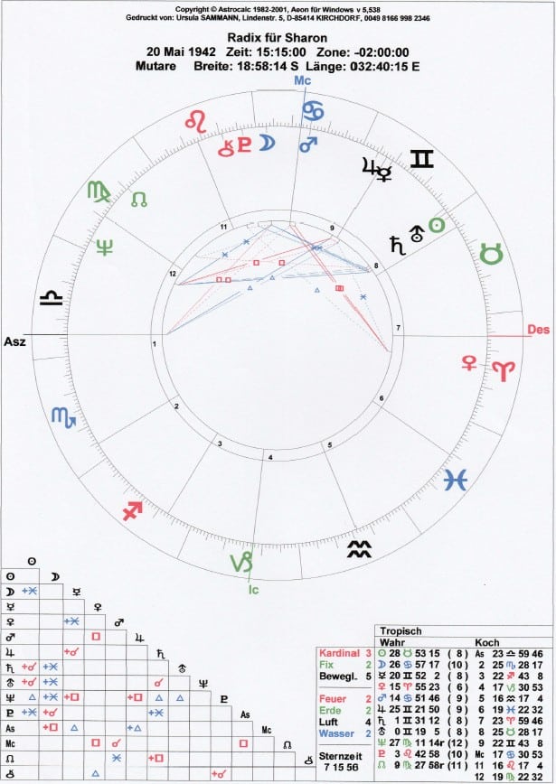 Da ich stets auf der Suche nach einer Botschaft der Seele bin, schaue ich bei der Betrachtung der vollen Hälfte stets nach der Position von Chiron. Er gibt Auskunft darüber welches die tiefe seelische Verletzung ist. Er trägt gleichzeitig die Botschaft wie Heilung aussehen könnte in sich. Er ist der Schamane im Horoskop. (3) Bei Sharon ist er im 10. Haus. In der Zeit als sie geboren wurde, 1942, war Emanzipation kein Thema. Und obwohl sie Bedienstete hatten, hatte die Mutter aus gesellschaftlichen Gründen keine Chance eigene berufliche Ziele zu verfolgen, geschweige denn Talente zu entfalten. Das ist gut an der Mond-Pluto Konjunktion im 10. Haus zu erkennen. Infolgedessen wurde die Botschaft transportiert, dass Frauen kein Recht auf Selbstentfaltung haben. Meine weitergehende Betrachtung würde den Aspekten zu Chiron, dem Herrscher des 10. Hauses und der Frage, ob das über mehrere Generationen der Fall ist, siehe Saturn und Pluto, gelten.