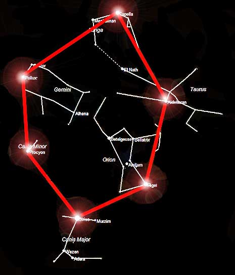 Das Wintersechseck (vgl. Abbildung) ist also jetzt komplett sichtbar: Verbindet man die Sterne Capella (Fuhrmann), Aldebaran (Stier), Rigel (Orion), Sirius (Großer Hund), Prokyon (Kleiner Hund) und Pollux (Zwillinge) miteinander, so erhält man das – etwas verbogene – Wintersechseck.