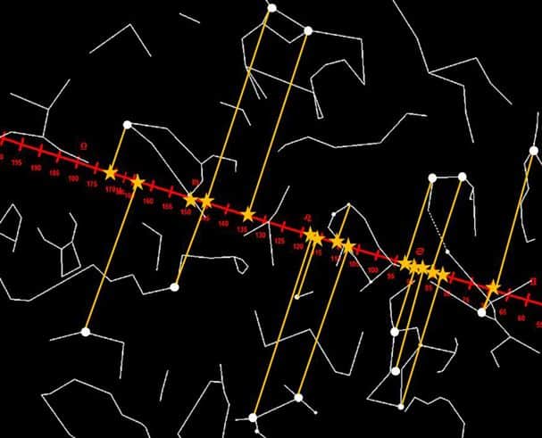 Die Sterne und der ganze Kosmos sind „beseelt“ – jedenfalls für mich und aus diesem Grund behandele ich beide mit Respekt. Ein Respekt, eine Betrachtungsweise, die anerkennt, dass sie einen ganz bestimmten, dreidimensionalen Platz am Firmament haben, und dass sie nicht zweidimensional auf der Ekliptik liegen. Ich weiß, dass die meisten Astrologen die Sterne lieber auf die Ekliptik projizieren (ekliptikale Länge) – wie Schmetterlinge, die auf einem Brett aufgespießt werden (vgl. Abb.).