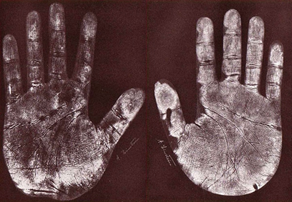 Albert Einsteins Hände – aus der Kollektion der Berliner Handleserin Marianne Raschig, die zwischen 1924 und 1935 eine Sammlung von Handabdrücken anlegte.