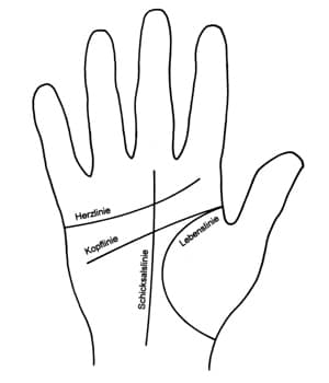 Die Lebenslinie bildet eine Rundung um den Daumen, die Herzlinie entspringt der äußeren Handkante