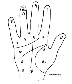 Kleiner Finger = Merkur, Ringfinger = Sonne, Venus/Waage, Mittelfinger = Saturn, Zeigefinger = Jupiter, Daumen = Mars (und Sonne, hier nicht abgebildet).