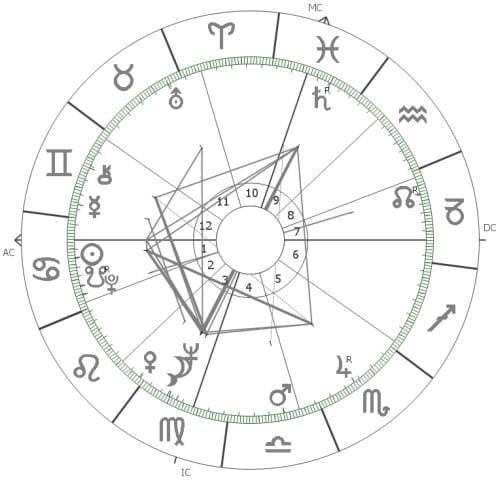 Das große Talentdreieck wird durch ein kleines erweitert, das das Sonne/Jupiter-Trigon mit einer Mond/Neptun/Lilith-Konjunktion in der Jungfrau verbindet. Dadurch ergibt sich eine Drachenfigur, ein Symbol für ein hohes spirituelles Potenzial, das der Dalai Lama zweifellos verkörpert und durch das Jungfrau-Zeichen pragmatisch in den Alltag integrieren kann.