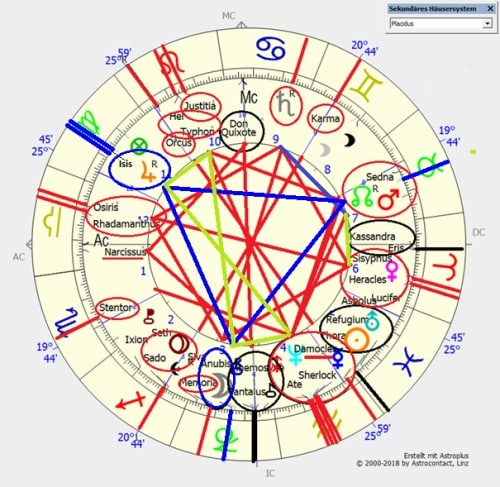 Die thematisch relevanten Asteroidenstellungen zeigen Orcus‘ Wirkungsweise und decken seine Themen sehr präzise auf: Besonders zentral ist das von dominanter Bestrafung durch Autoritäten bzw. dem Schicksal (Löwe-Justitia in 10 in Opposition) bedrohte, überflutete dissoziationsbetonte, eskapistische, kindliche, innerseelisch plötzlich schockhaft öffnende Denken (Wassermann-Merkur in Konjunktion zu Neptun, dem bedrohenden Machtwechsel-Asteroid Damocles, der oft verblendeten Ate, dem forschenden Sherlock im karmischen Drachenbauch-Quadrat zu Nordknoten und fallengelassener Extremaußenseiterin Sedna und auch noch zum revierbedrohten Stier-Mars in 7 – siehe auch die kriegerisch-archaische Widder-Eris am DC).