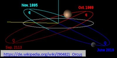 Orcus wurde vom Team des Eris-Entdeckers Mike Brown am 17.02.2004 per Fotonachweis in Palomar, CA entdeckt und ist ca. 917 km groß, etwas kleiner als Ceres. Er hat auch einen 2007 bekanntgegebenen ca. 276 km großen Mond namens Vanth, nach einer etruskischen Dämonin benannt, eines Psychopompos, der die Toten in die Unterwelt führte und deren Taten auf einer Schriftrolle notierte.