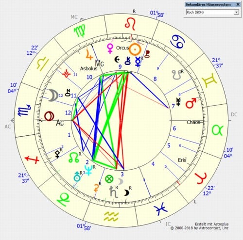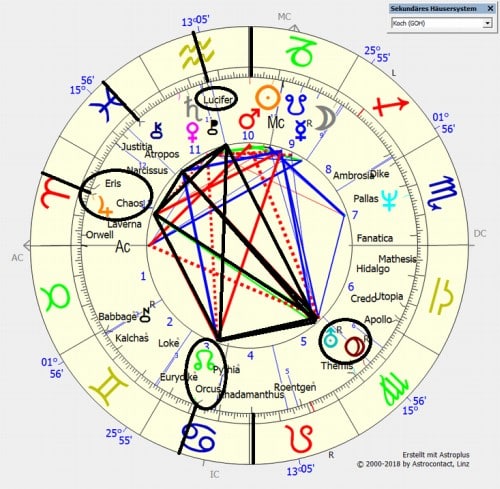 Widder-Jupiter / -Chaos Quadrat Krebs-Orcus / Nordknoten letztere im Trigon / Sextil – Auslaufwinkel den Uranus-Chiron-Opposition incl. Wassermann-Venus / Saturn / Zeus – Konjunktion: gnadenlos progressiv-elitärer Geizkragen.