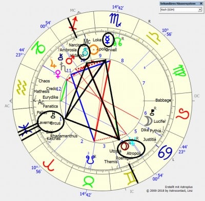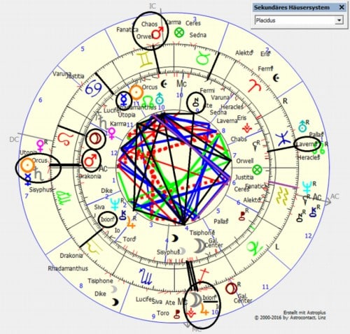 – Adolf Hitler 20.04.1889, 18:30 LMT, Braunau am Inn (Rodden AA): Waage-Uranus Trigon Wassermann-Orcus Konjunktion Nessus (heimtückischer, gnadenlos strafender Rächer), letztere im KZ-Quadrat zu Vesta und im Anderthalbquadrat / Halbquadrat-Auslaufspannungswinkel zu seiner Steinbock-Mond / -Jupiter Opposition Krebs-Chiron.
