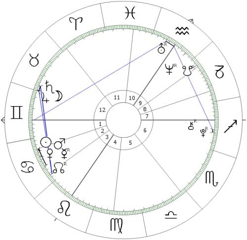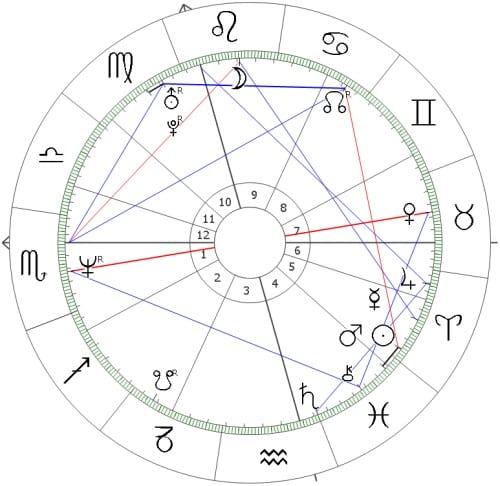 Seine Hilfsbereitschaft, sein Lebensmotto, seine Hobbies und sein regelmäßiger Konsum von Sucht-mitteln, deuten hin auf eine Persönlichkeit mit Neptun/Fische-Thematik. Astrologisch finden wir diese im Horoskop mit der Geburtszeit „ca. 22 Uhr“: Neptun als Herrscher des fünften Haus im ersten Haus.