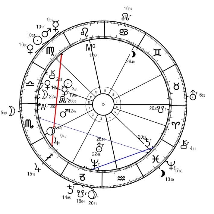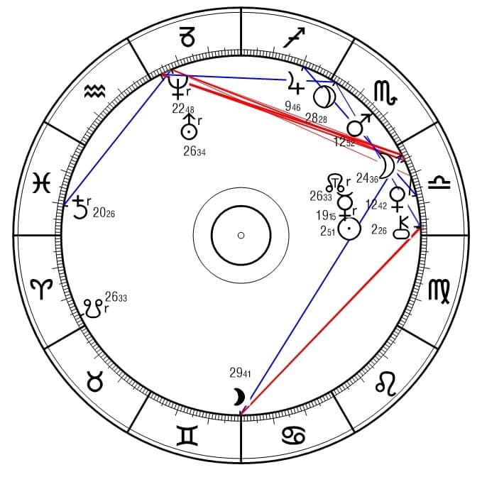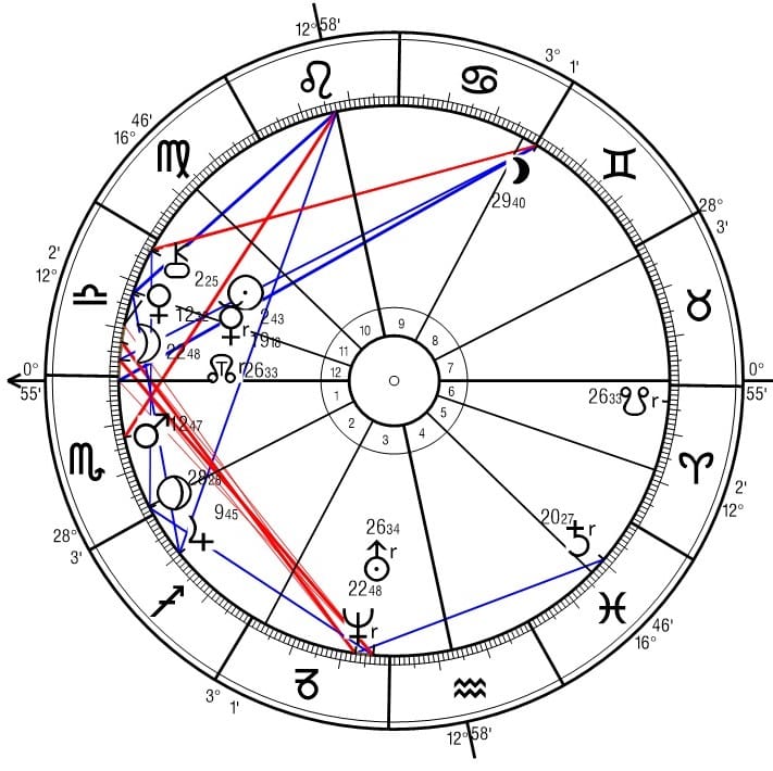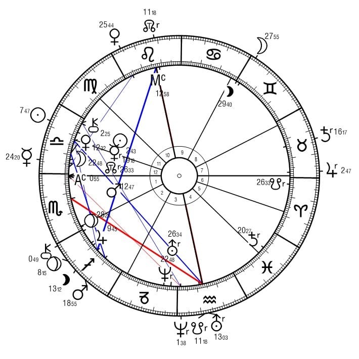 Mond in Haus 12 als wiederholtes Thema die verlorene Mutter bzw. das verlorene Elternhaus. Venus und Merkur stehen auch für Geschwister/Schwestern. Beide landen ebenso im Haus 12 im Abseits.