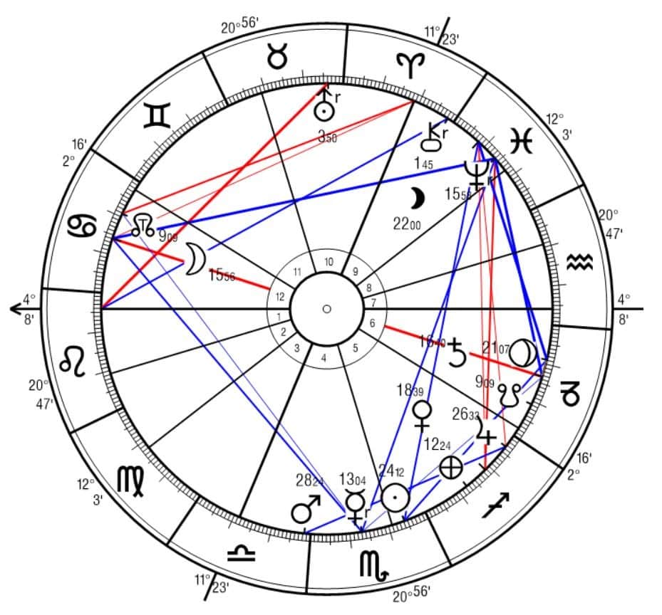 Das fünfte Haus, die Bühne der Selbstdarstellung wurde tatsächlich eine Bühne, aber für den Untergang (Sonne im Skorpion) um nicht zu sagen Absturz der Hauptperson.