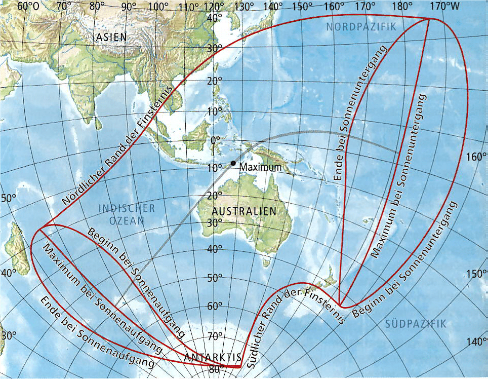 Diese Finsternis startet in den frühen Morgenstunden im Indischen Ozean und läuft dann über Australien, Taiwan, die Philippinen und Papua-Neuguinea. Sie beginnt um 3:34 MESZ und endet um 8:59 MESZ. Sie erreicht ihren Höhepunkt um 6:17 MESZ nördlich von Australien. Dann wird für 1 Minute und 16 Sekunden der Mond die Sonne vollständig bedecken. Ganz zu Anfang und zum Ende zeigt sich für wenige Sekunden eine ringförmige Phase. Daher wird diese Ekliptik auch hybride Sonnenfinsternis bezeichnet. Diese Sonnenfinsternis ist nicht von Europa aus zu beobachten.