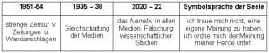 Die internationale Szene war geprägt von schnellem Wechsel und gewaltvollen Revolten. Die große Spaltung damals war die Angst des Bürgertums vor der radikalen, sozialistischen Arbeiterbewegung (1935-38 war es die Angst vor den Kommunisten). Radikale Maßnahmen sollten die Menschenmassen dazu bewegen, den Staat zu unterstützen. Die Medien wurden streng zensiert. (Das, was 1851-52 passiert, erinnert doch sehr an die Methoden mit welchen das NS-Regime seine Macht behielt und an die gefälschten Medien 2019-22. Früher hieß es Zensur, heute „fake news“).