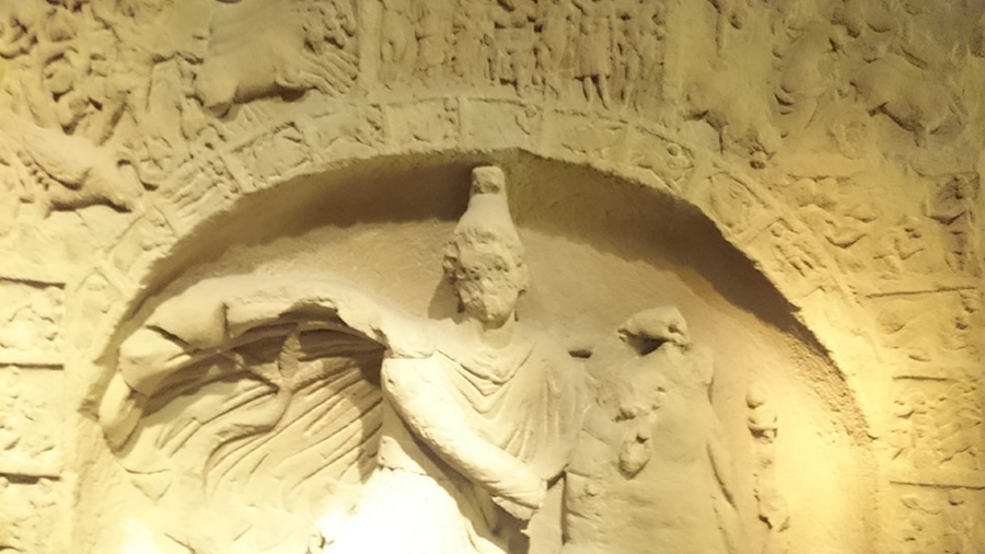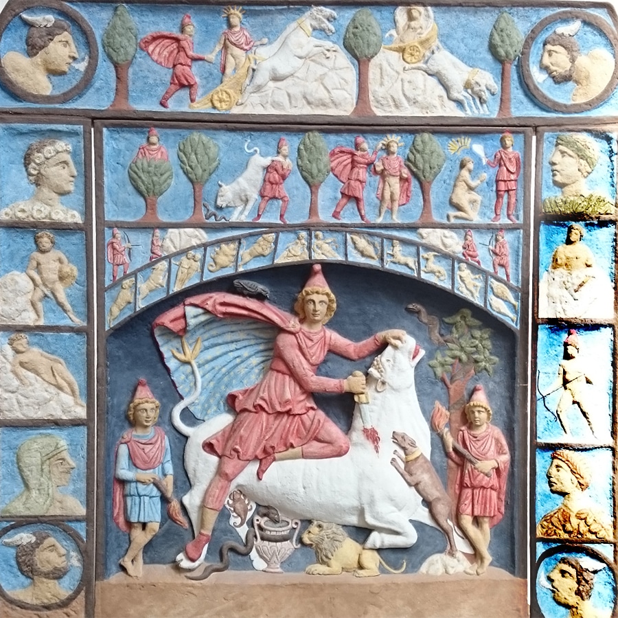 Der antike Mithras gilt als Sohn des Sonnengottes Helios und wird zumeist als Mensch (Wassermann) dargestellt. Am unteren Rand des Altars komplettiert ein Löwe das fixe Kreuz. Und um die Verbindung noch offensichtlicher hervorzuheben, sind manche Altäre von den zwölf Tierkreiszeichen umgeben.